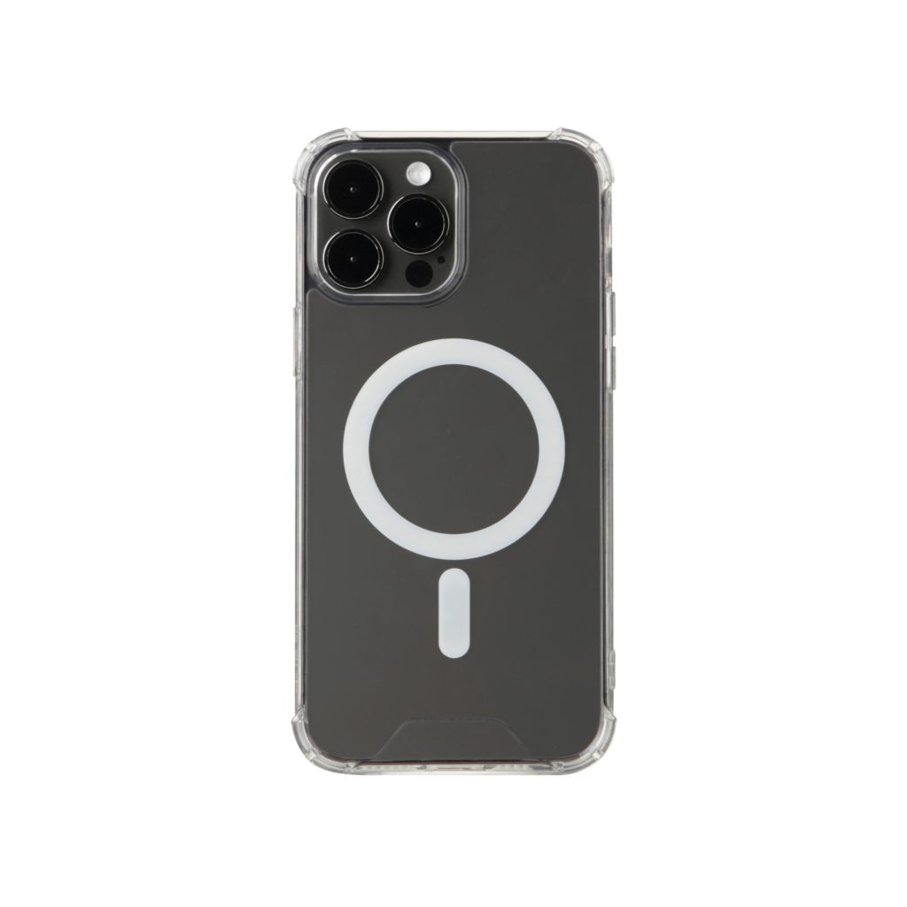 Coque transparente en TPU souple avec dos acrylique renforcé, compatible MagSafe.